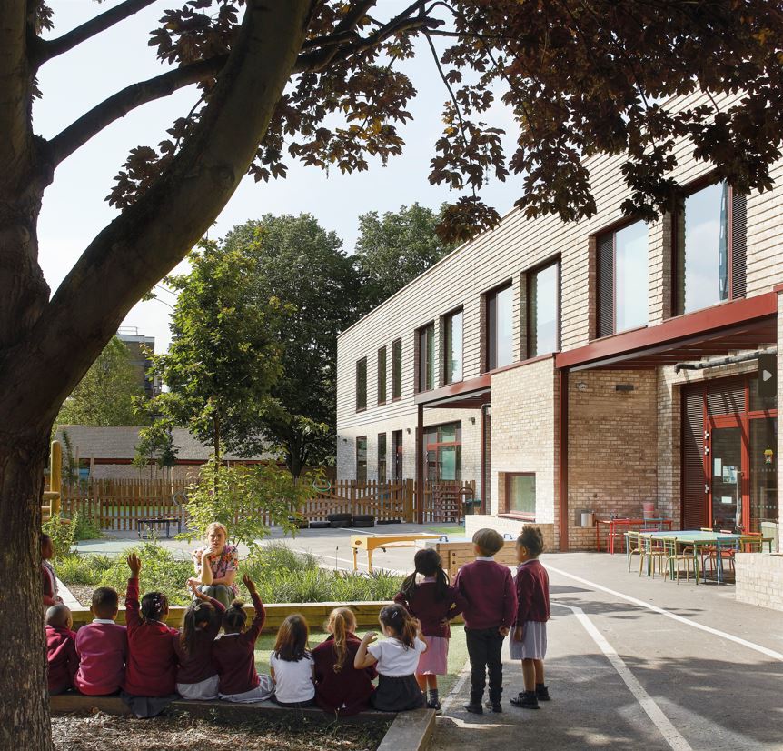 The 1970s buildings of Rotherhithe Primary School were barely visible from the main road that they faced when Feilden Clegg Bradley Studios and Fabrik Landscape Architects were appointed by London Borough of Southwark to design a new and expanded school on the site in 2017. Southwark had embarked on an inspiring programme to upgrade and expand its stock of primary schools and Rotherhithe was set to benefit from this investment. The single-storey buildings were exhausted and at the end of their life, with various plans for previous re-builds not pursued. Typical of buildings of their age and construction, they were uncomfortably cold in winter and too hot in summer. Various additions and temporary buildings had been absorbed into the layout over the decades, but they lacked coherence, had poor environmental control and provided neither a clearly navigated layout nor level access. The children’s needs meant that smaller spaces were needed to do targeted work with small groups. Without sufficient space formally available for this, circulation spaces had been cleverly appropriated and decorated to create niches for such intervention, but they lacked privacy or the right acoustics. What was clear was that the school was creatively making the best use of every space to support its children in challenging circumstances. In a similar way, great effort had been invested in the playground, which benefitted from many mature trees, a generous area, and spaces for active play, quieter activity and forest school learning.