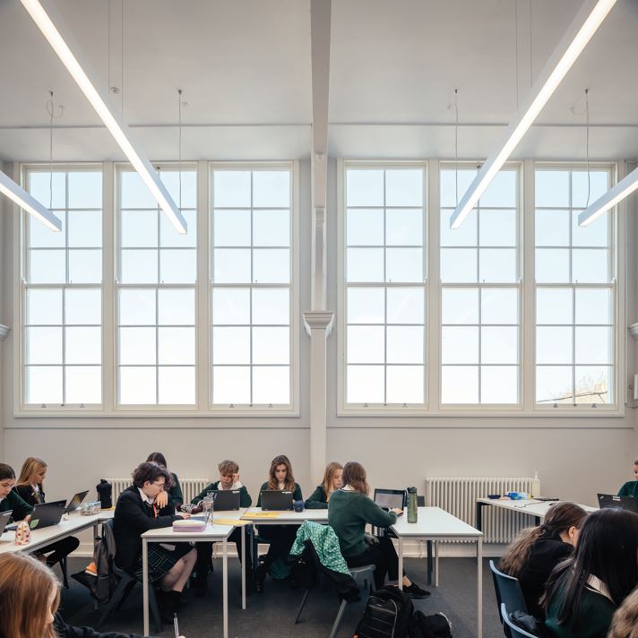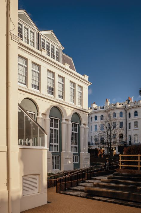 Brighton Girls is an all-through school in the heart of Brighton and a founding school of the Girls’ Day School Trust. Formerly Brighton and Hove High School, it was established in 1876 and is proud to have been an early champion of girls’ education in the UK. Education has moved on since then, but while the school’s older buildings are much loved they were no longer entirely fit for purpose. Having completed a pop-up prototyping hub at the school in 2019, Walters & Cohen were asked in 2020 to support the school’s ambitious project to reunite the senior school and prep school on one site, creating a ‘family of big sisters and little sisters’. The architects have carried out this plan, reuniting the senior and prep schools onto one site and upgrading several older buildings to suit contemporary educational needs. The practice has created a sensitive reworking of much-loved existing buildings, while adding new elements to expand the school’s capabilities. This ambitious project brings the schools together to create the so-called ‘family of big sisters and little sisters’. The sensitive refurbishment of three buildings – ‘Montpelier’, the Grade II listed ‘Vicarage’ and ‘Temple’ – has transformed the spaces into learning and socialising spaces fit for the twenty-first century, while enhancing their charm and character. Sensitive refurbishment of Montpelier and the Grade II listed Vicarage and Temple has transformed them into wonderful learning and socialising spaces fit for the twenty-first century while enhancing their charm and character. In the Temple, the ground floor has been converted into an exciting coffee- shop-style space for study and social activities as well as presentations, conferences and events.
