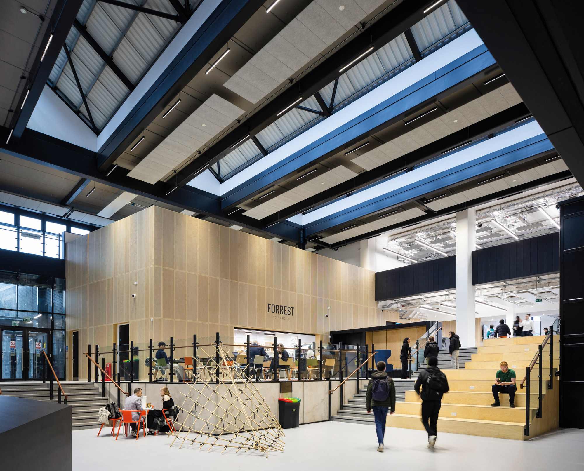 THE design, by BDP’s education architects in Manchester and Birmingham, adds a contemporary extension, which links the Maurice Foss and Graham Sutherland buildings to establish a new, creative heart of the campus. Now named the Delia Derbyshire building, it further connects the city of Coventry with the university by acting as a public hub and a display for creative activity. Coventry University will use the building to play a transformational role in the growth of the creative industries in the region and to positively influence the cultural development of the city, following on from its role as UK capital of culture in 2021. The design, which includes a landscaped central piazza, also supports the university’s predicted growth in student numbers and enables more active engagement with local communities and local enterprise. For the students, the open plan and flexible learning spaces stimulate new pedagogies and cross-disciplinary working in the fields of architecture, interior design, automotive design, games, film, photography, immersive and digital media.