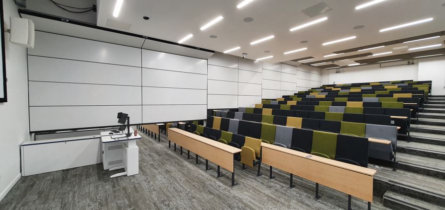 Built with a sharp focus on sustainability, the Learning & Teaching Building was created through the refurbishment and integration of two existing buildings – the Colville Building and the Category B-listed Architecture Building. It is a collective space for all students and staff, comprising a variety of first-class learning and teaching facilities. In the tiered auditorium, a Skyfold Zenith stepped moveable wall was the ideal solution. Offering an outstanding 59dB acoustic rating and descending from the ceiling at the push of a button, the vertically rising moveable wall offers a unique “thin path of travel” which means it can descend into tight spaces, in this case the narrow gap between the seating.