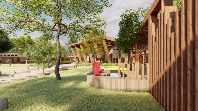 The design comprises separate pavilions for various school functions, connected by covered walkways and canopies and arranged to envelop a central landscaped, terraced area with an outdoor class at its centre. This promotes an interaction and connection with nature. It encourages sociability and play, whilst maximising the opportunity for outdoor learning, exercise and fresh air in all weathers.