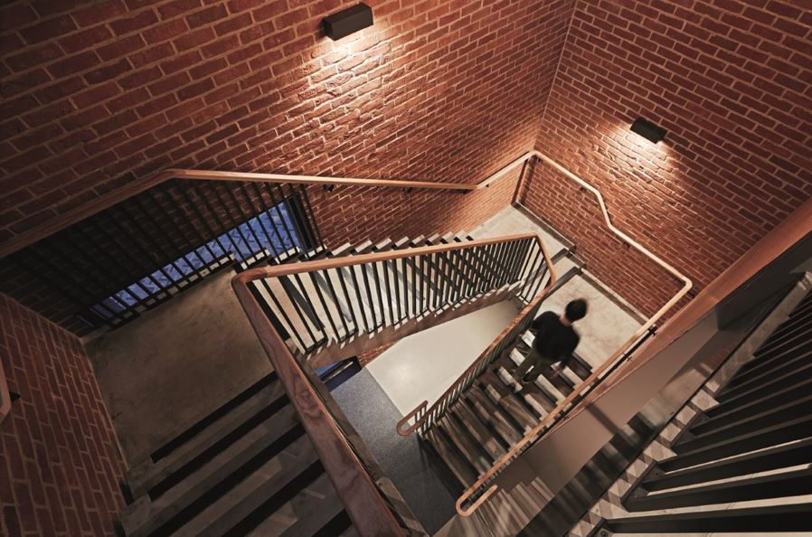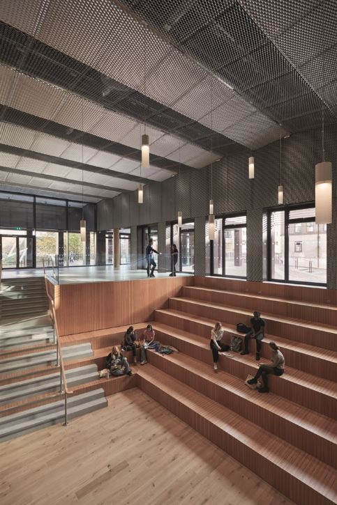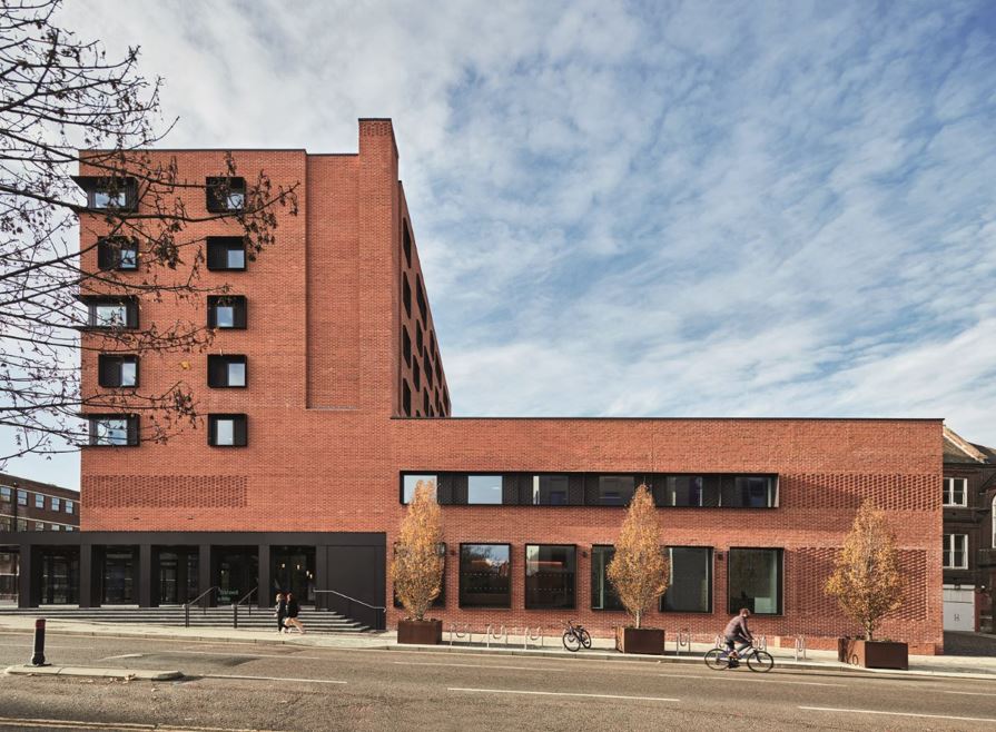 Could we have retained the old building and refurbished them to modern standards? Perhaps. But against that, this was a dilapidated structure with a condemned basement carpark; the building was poorly arranged on the site; and it was very tight to the River Wensum with a hugely underwhelming street presence. In addition, NUA bought the site with the intention of providing, not only student accommodation, but also much needed teaching and studio space, including a 300-seat lecture theatre. Such a brief could not have been accommodated within the existing structure. NUA have a proud tradition of re-purposing existing city-centre buildings, but this project called for their first new-build. The new building contains a number of high-carbon materials including concrete, steel, brick, aluminium and glass. Could low-carbon alternatives have been used instead? In some cases it is possible they could. It’s worth drilling down into this a little. The building contains a lot of concrete (about 485 cm) - it’s used in the piles, foundations, floor slabs and the retaining walls of the basement. This amount of concrete comes with a heavy carbon price tag but it’s hard to know how much of it could have been avoided - especially in the sub-structure. Concrete with a lower carbon content (using cement alternatives such as GGBS) could perhaps have been used but at a significant cost. Easier savings might have been achievable in the floor slabs - instead of concrete (poured onto a steel deck) we could have considered cross-laminated timber (CLT), a relatively new strategy that is increasingly being employed. If we were designing such a project today, we would work with the structural engineer to produce a carbon report to analyse the structural design and look at options for optimising structural efficiencies. The lower levels of the building utilise a conventional steel super-structure. We were keen to consider glulam timber but came up against intractable issues. The heavy loads of the eight-storey building, combined with wide spans needed for the large teaching spaces on the lower levels, proved too great. Not long into the design process, the new Regulation 7(2) was introduced following the appalling Grenfell Tower tragedy which banned any combustible materials from being used within the external walls of residential buildings more than 18m high.
