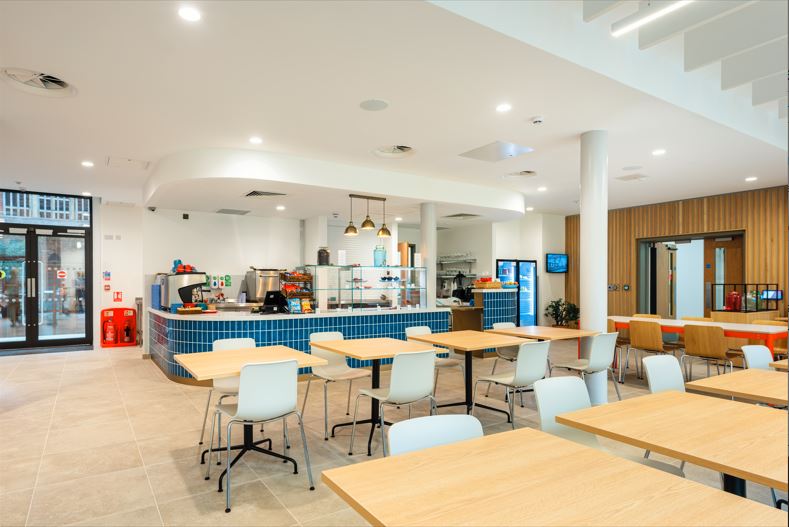 Many of Lucy Cavendish College’s undergraduates will be living away from home for the first time. So, the lighting for the new building also had to help create a welcoming, inclusive environment to offer a sense of community where students can achieve the best academic outcomes in their home away from home. The bedrooms are designed to be comfortable, welcoming, and structured, enabling students to get to know each other in manageable groups. Here the wall mounted TRILUX LC60 aids the main aim. Its 3000K warm, welcoming light is easily dimmable and creates a cosy, inviting atmosphere for students to retire to after a long day. A study café space on the ground floor includes a range of facilities, including study booths and intelligent screens, encouraging students to collaborate in the way that suits them best. TRILUX Limba pendants, in a gold and black finish, add striking appeal and help form the café setting. Its 3-D faceted reflector and opal acrylic ring offer exceptional glare control, ideal for hi-tech working aids.