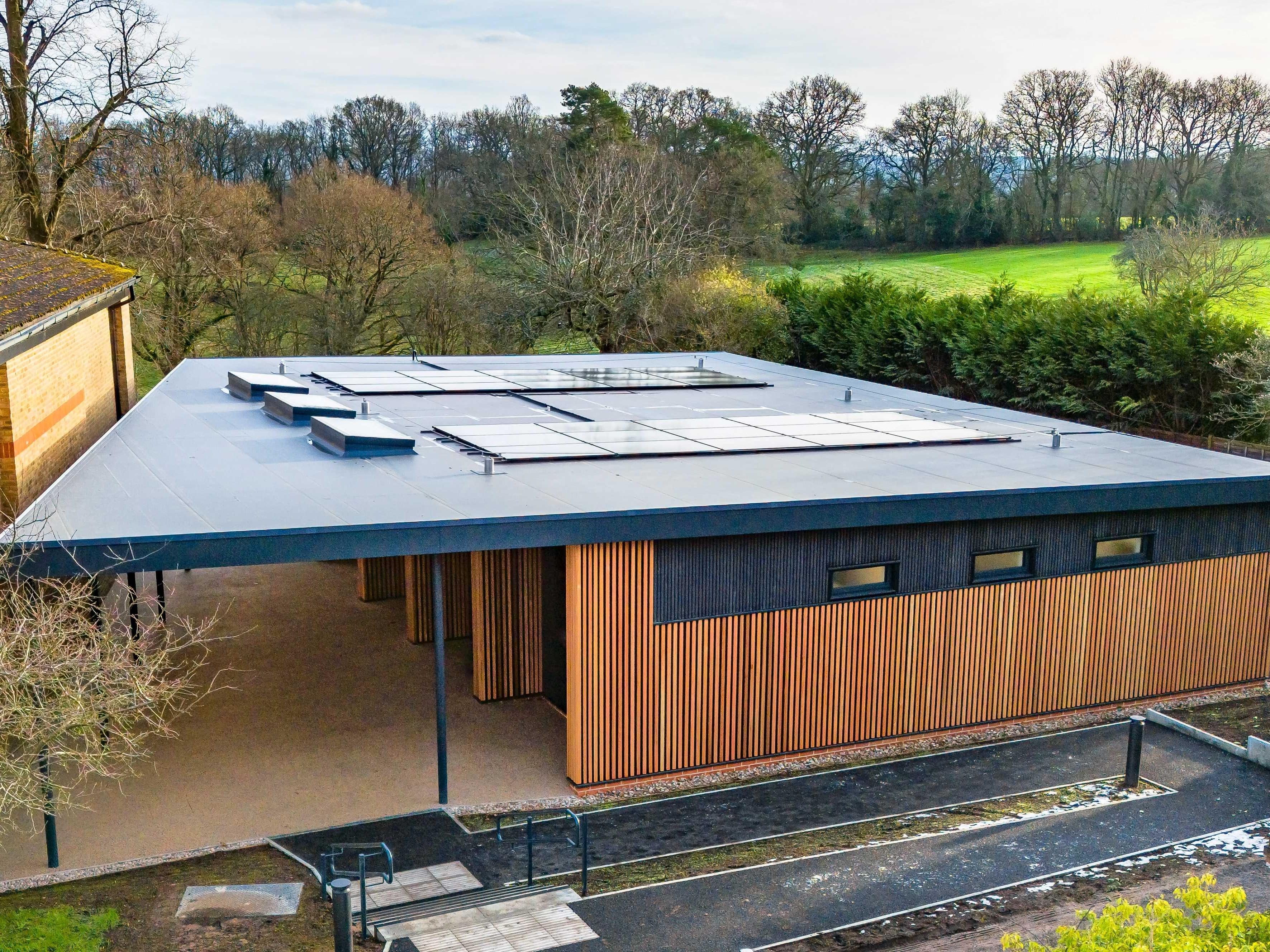 Built in just five months, the building features two spacious changing rooms, each accommodating up to 54 pupils aged 9-13, complete with showers, toilets, and essential storage spaces. A large, sleek canopy seamlessly connects the new building to the existing sports hall, offering covered access in all weather conditions and much needed storage for PE equipment.