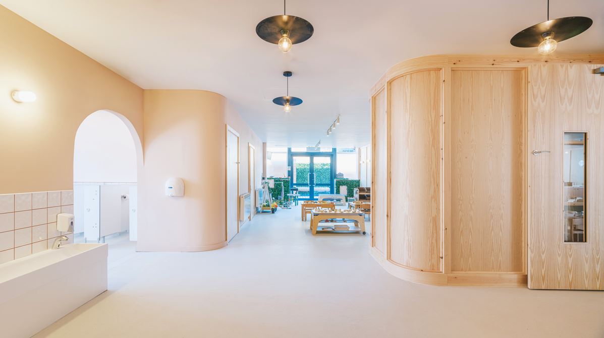 The significant transformation of the commercial building into a contemporary nursery was achieved in just six months for £90/sft +VAT. The interior fit-out reflects various education approaches - a modern child- led learning methodology - that the nursery will use alongside other teaching methods for Early Years children. Accordingly, Delve’s designs allow for exploration, freedom of movement and multiple uses of each space. Glazed partitions provide natural light across the nursery, and at the heart of the plan is a communal dining space, designed as a multi-functional social area with access from all rooms. Other facilities include kitchen, bathrooms, waiting area, office and an outdoor timber covered play area. Curved forms were used throughout the Learning Tree to differentiate it from typical nurseries with round arches, playful portholes and curved partition walls. Natural materials were installed including timber-framed, pine-faced plywood walls, recycled rubber flooring and low VOC finishes throughout.
