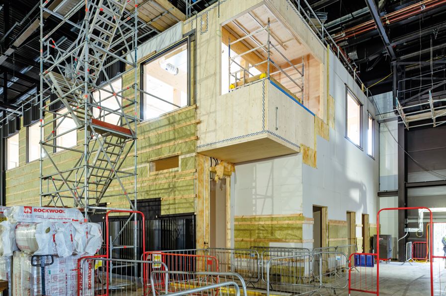 The package included some 592 sqm of engineered timber from sustainable sources, mainly in Northern Europe with a 100% PEFC certified full chain of custody, delivering maximum points at MAT03 under the latest 2018 version of BREEAM; sequestering 379 tonnes of CO2e. The Director in charge of the project for Engenuiti, Clive Fussell, commented: “We have always wanted to be involved in projects which, both at their initial conception and their final detailed design and execution, optimise the benefits of timber. And you can gain a lot of learning from each one’s challenges. It is also increasingly vital as timber designers to understand from the earliest stages of a project, how things will go together in terms of connections, the limits on erection, and manufacture: in order to minimise wastage during manufacture and logistics.” In some perspectives, the concept for PEARL evokes a Babushka doll with one structure being built within another: providing a two-storey space for seminars, testing and trial fabrication while the evaluation of larger urban environments are conducted in the factory style main space.