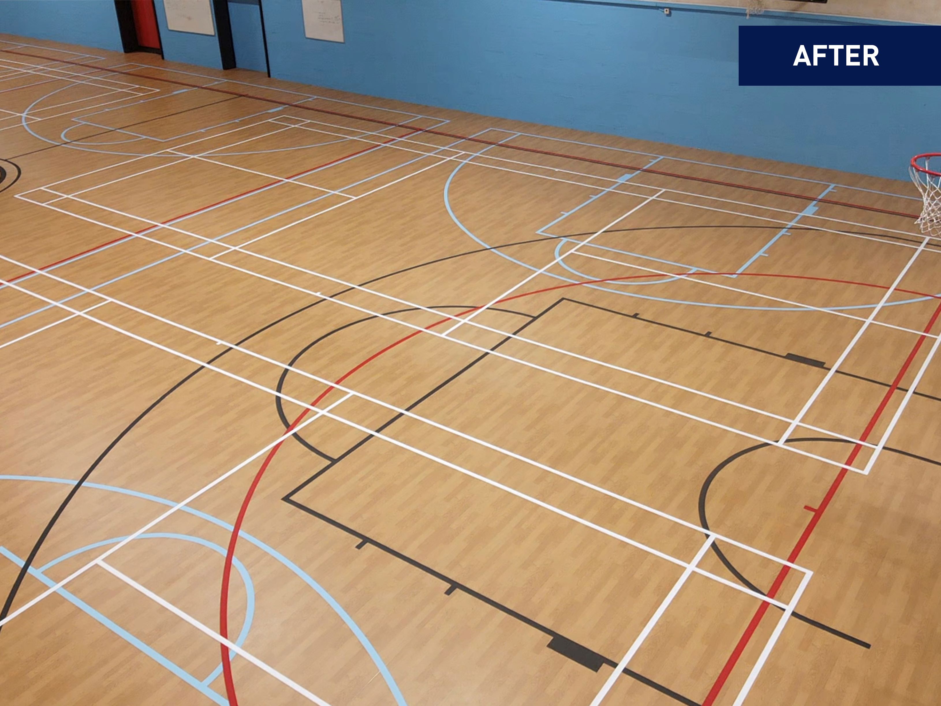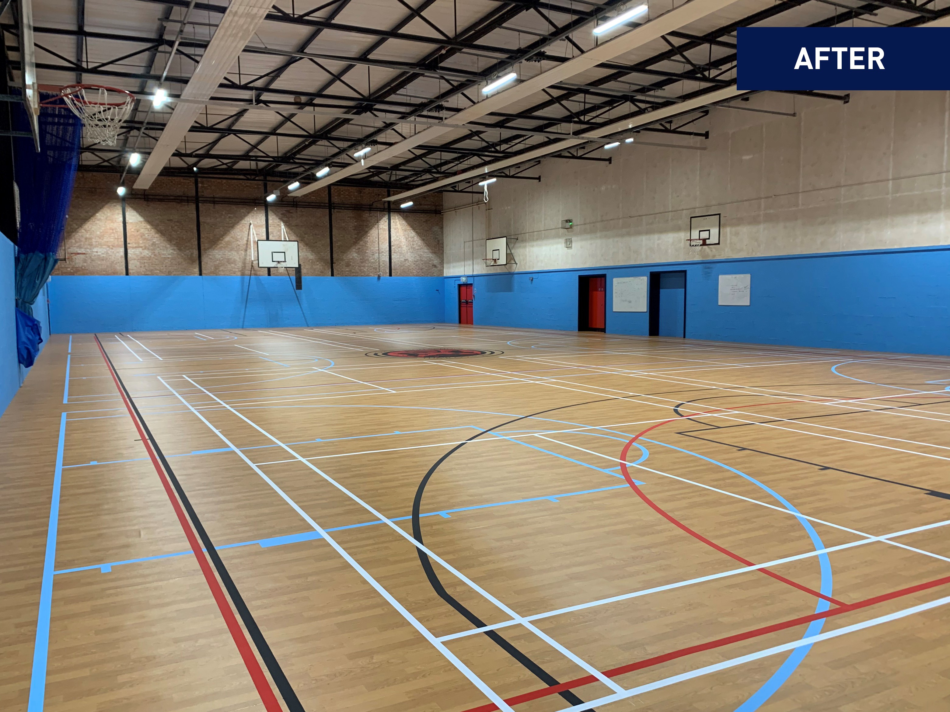 The flooring install in the sports hall was finally completed with appropriate line marking by Biddle Sport Ltd. A company renowned for their sports floor maintenance and court marking services.