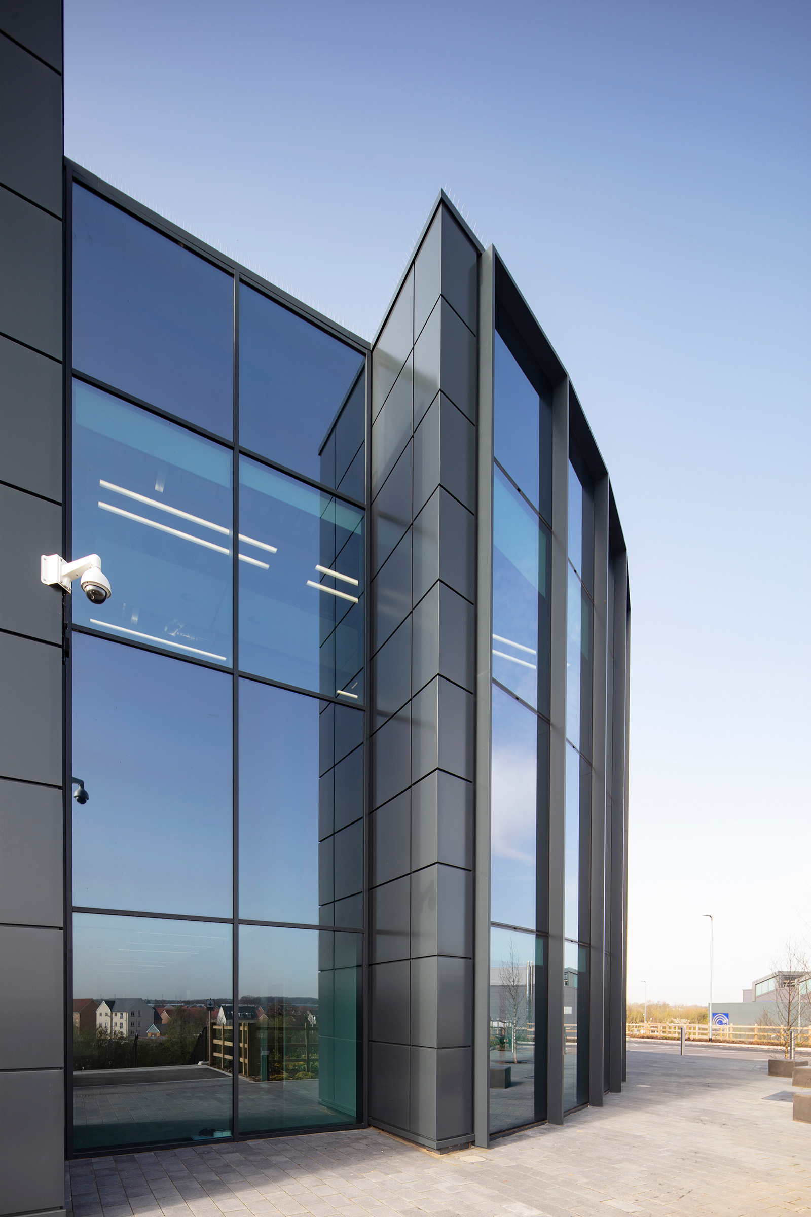 Fabricated and installed by Bristol-based Architectural Aluminium and Glass (AAAG) to a planned eight-week delivery programme, the curtain walling combines a linear and an arc section on plan to create a striking faceted façade that runs 43m and is 10m high. The double-height curtain wall joins the rectangular arched entrance at a sliced angle.