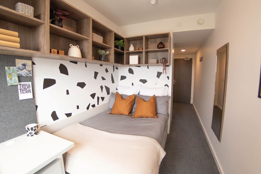 This was combined with Forbo’s Eternal de Luxe Decibel vinyl floor covering in the communal and studio kitchens. This solution served a double purpose: It reduced impact sound by 17 dB and provided an R10 slip rating, both of which were key to creating healthier and safer spaces for residents to live in. With safety in mind, Alicia also specified a range of Forbo’s safety flooring. And to maintain the condition of the interior floor coverings, Alicia opted to use Forbo’s Coral Classic entrance flooring system in the Mouse Grey colourway. Alicia explains more here: “We wanted a solid barrier matting, that would reduce the walked-in dirt that you’d expect to see in a city centre university accommodation. With students coming and going all day, it was key to install an effective entrance flooring system to reduce cleaning and maintenance”